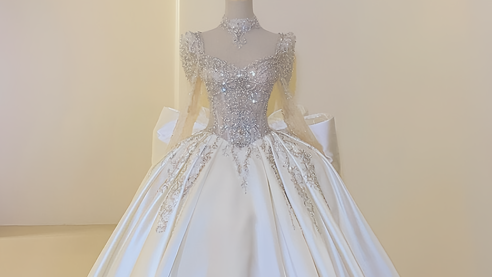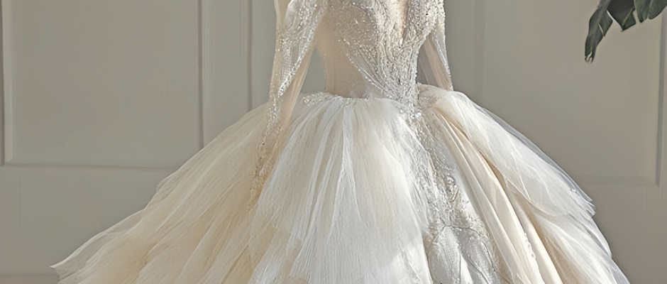 这款婚纱比较建议小清新或是人文气息浓厚的新娘选择,飘逸的头纱、镂空的蕾丝花边加上小碎花的透明褶皱,让新娘穿上后能营造出自然浪漫的风格,这也是这款浪漫婚纱最好的体型