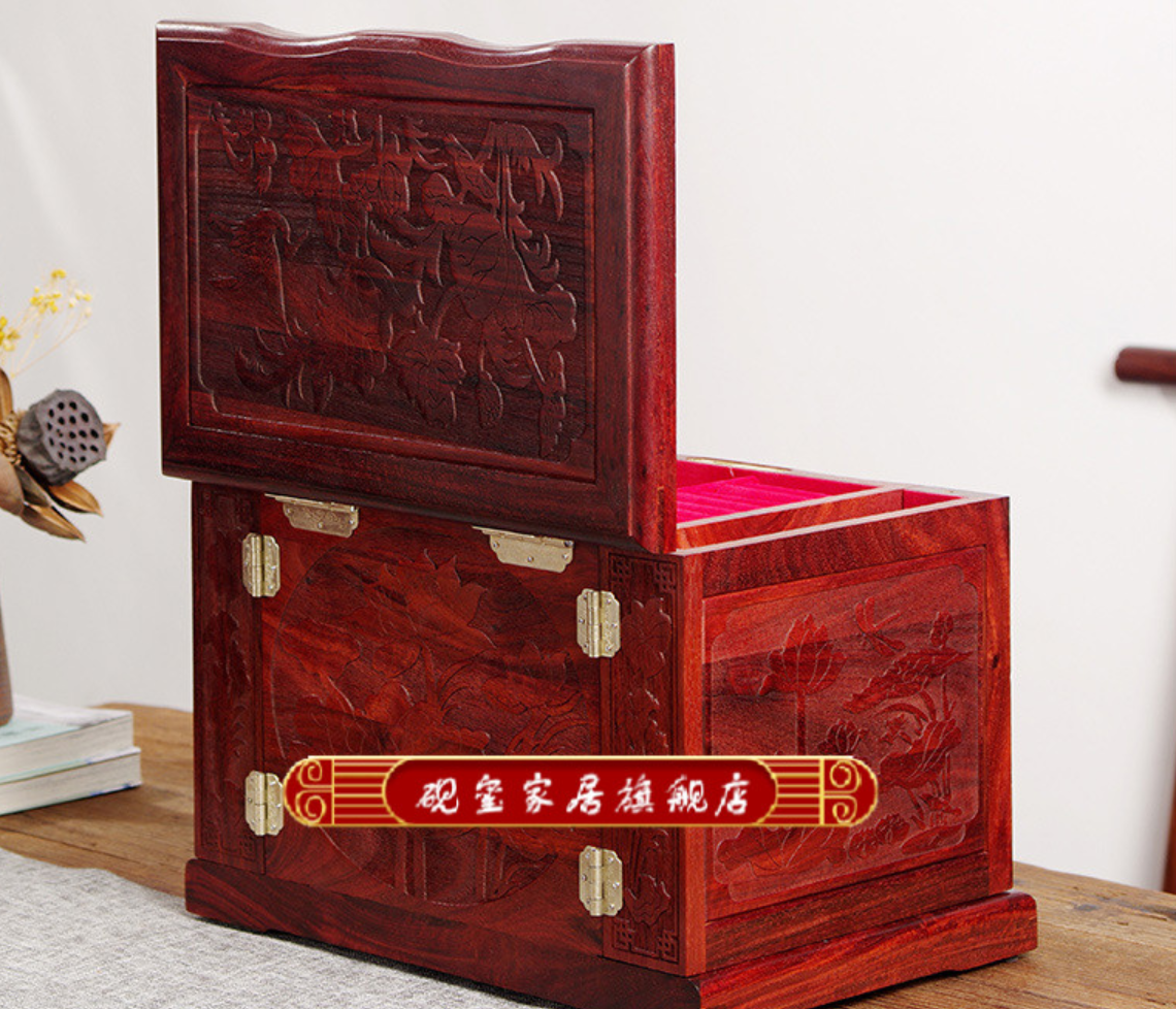 砚玺 雕花侧开饰品全锁多层多功能项链耳环戒指珠宝木质首饰盒 雕花荷塘月色首饰盒
