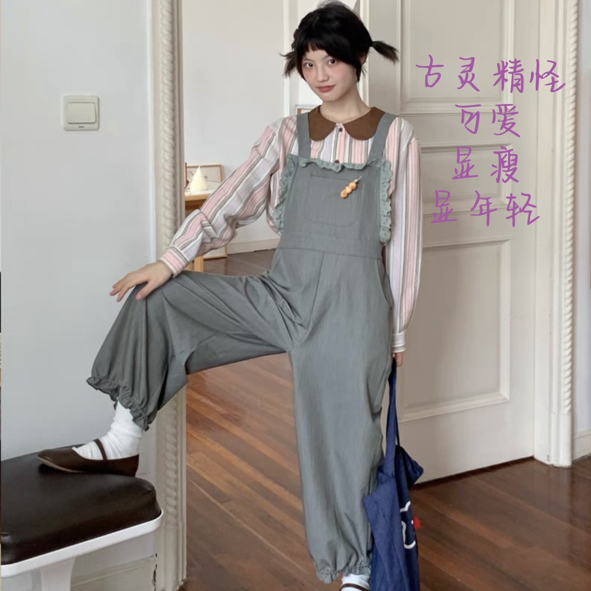 牛牛的外衣店灰色背带裤女学院风高腰蕾丝拼接小个子休闲百搭长裤子