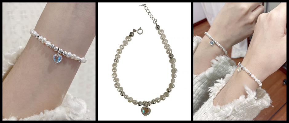 纯银爱心猫眼石天然淡水珍珠手串 纯银爱心珍珠手串