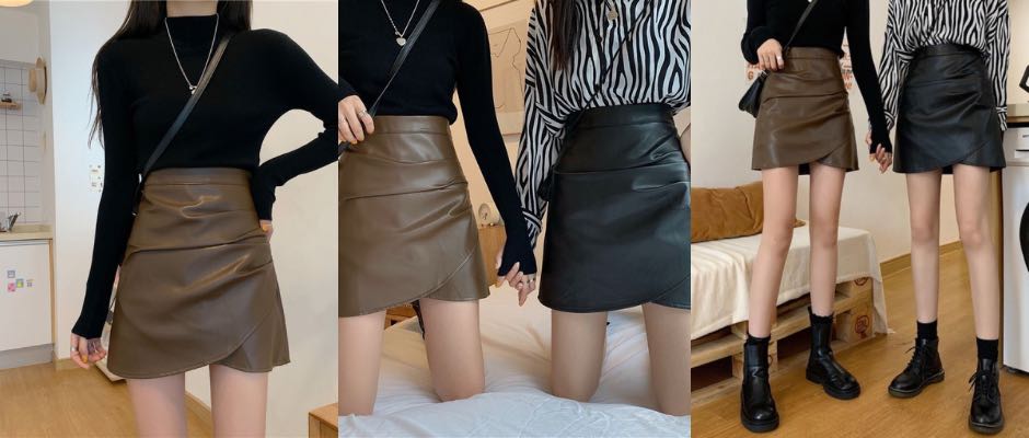 皮裙半身裙女2023秋冬新款高腰皱褶a字裙不规则显瘦时尚包臀短裙 黑色 S