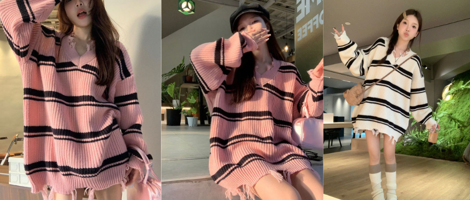 粉色条纹流苏设计感v领毛衣针织衫女韩版chic简约中长款上衣遮臀 粉色 X