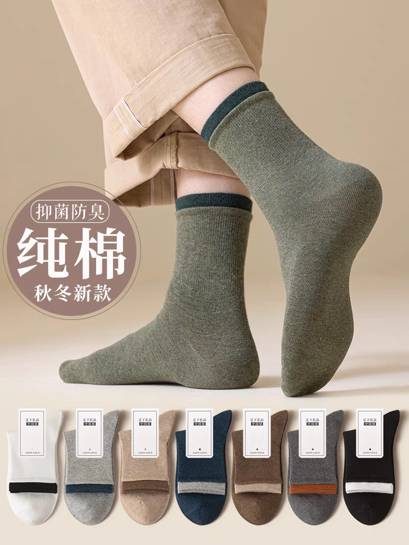 袜子男士中筒秋冬款100%透气纯棉无骨吸汗防臭抗菌秋季全棉长袜