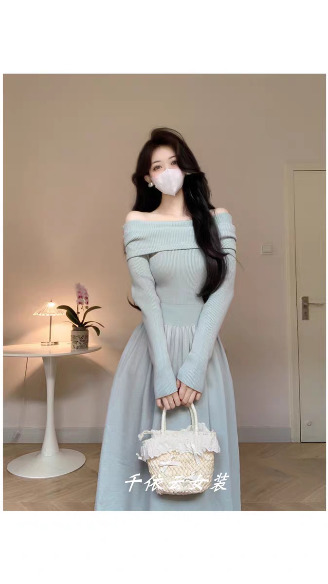 长袖一字肩针织连衣裙女秋冬显瘦收腰高级感打底露肩大摆毛衣长裙
