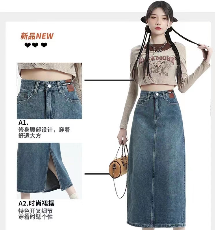 CICISHOP复古高腰牛仔半身裙女夏季中长款显瘦a字大码开叉长裙子
