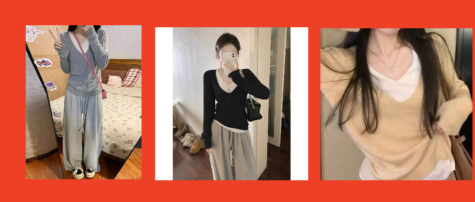 假两件v领毛衣针织衫女2023秋冬新款修身显瘦灰色内搭打底上衣潮 黑色 L
