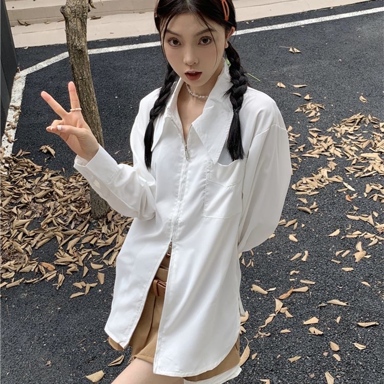 法式拉链白色长袖衬衫女秋季设计感小众宽松显瘦衬衣独特别致上衣