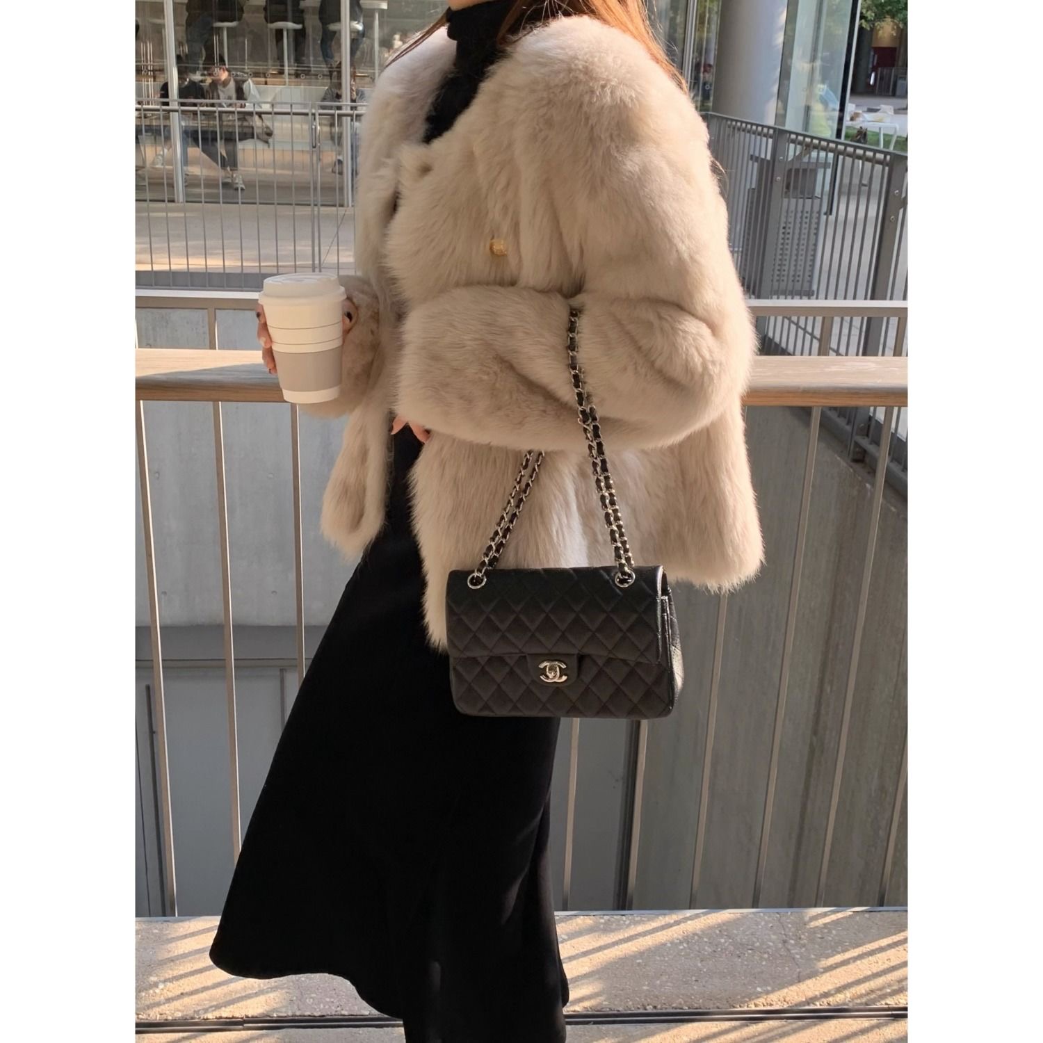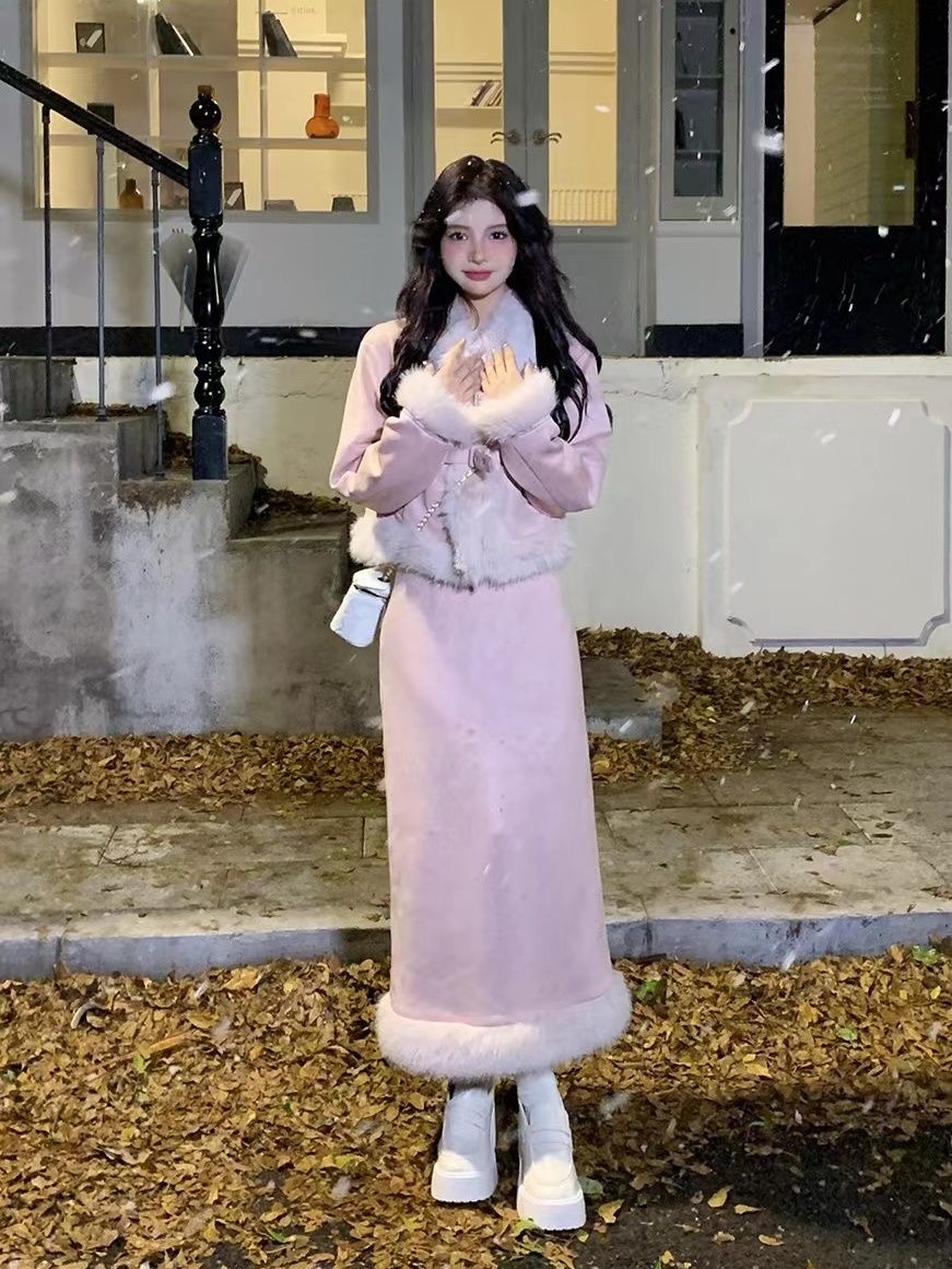 两件套秋冬新款千金风毛领咖色麂皮绒夹棉外套后开叉半身裙套装女