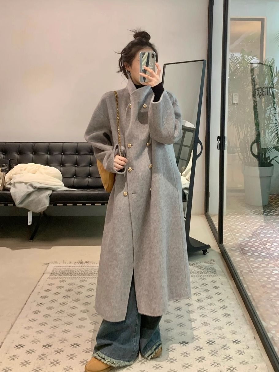 灰色呢子大衣女2023年秋冬款西装领双排扣宽松休闲中长款毛呢外套