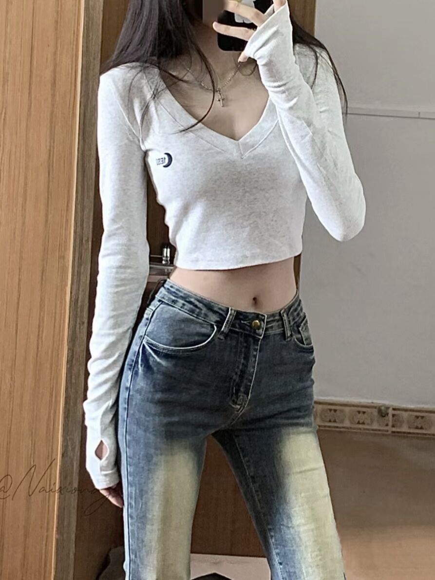 美式v领辣妹上衣女外穿秋冬新款小众设计感打底衫chic港味长袖t恤