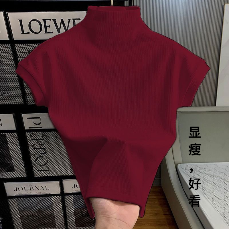 半高领黑色冰丝大码短袖t恤女夏季2023新款正肩紧身短款辣妹上衣