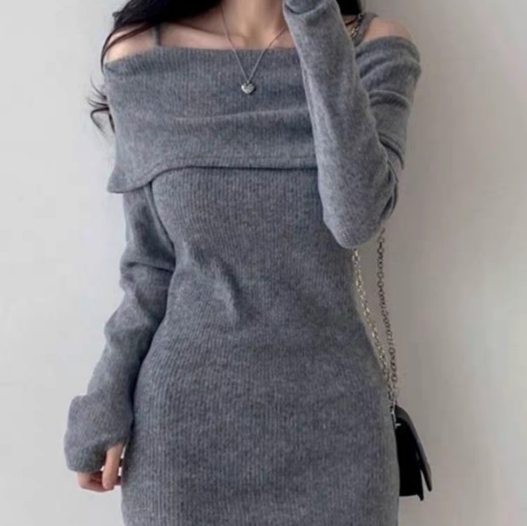 时尚减龄一字肩针织连衣裙女2023新款秋冬修身显瘦毛衣裙打底长裙 长款 粉色 S
