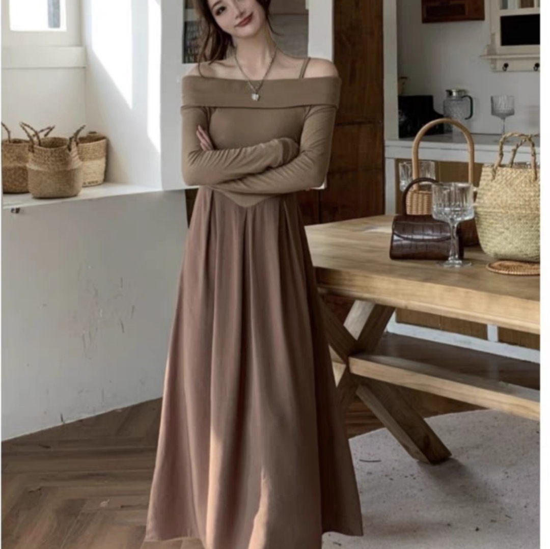 一字肩卡其色收腰长裙