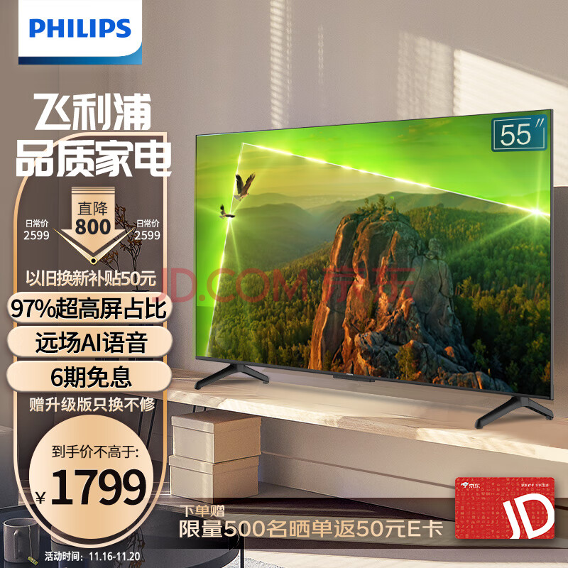 飞利浦(PHILIPS)55英寸 4K超高清智慧全面屏 金属机身 客厅影音远场AI语音智能液晶平板电视机55PUF7108/T3