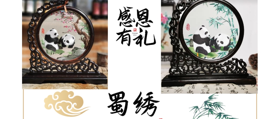 蜀绣双面绣大熊猫屏风手工刺绣摆件鸡翅木如意架礼品礼物成都特产