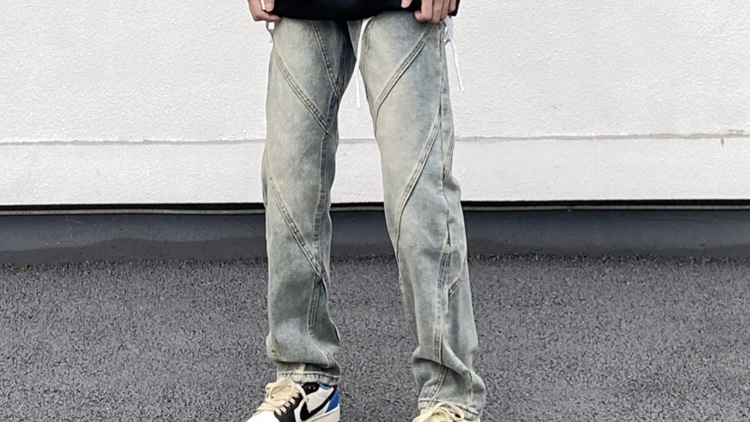 非潮勿近高街美式复古水洗拼接牛仔裤男宽松直筒hiphop垂坠感裤子