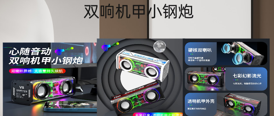 心随意动双响机甲小钢炮,蓝牙5.0双喇叭震感音质,10W大功率,硬核双喇叭,七彩幻影流光,透明机甲外壳,未来已到透明机甲感受科技的声音,蓝牙5.0连接让好音质注入耳朵大容量持久续航音乐停不下来