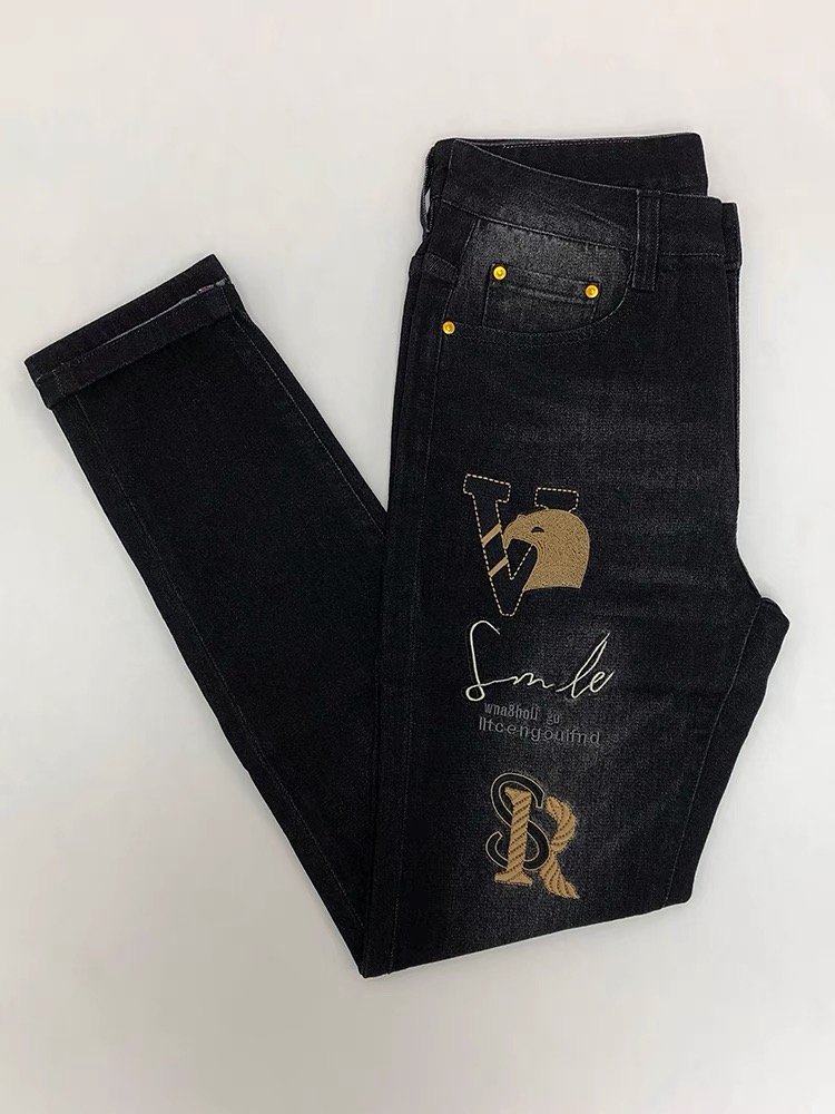 秋季新款黑色刺绣牛仔裤男2023年修身小直筒十字架中腰弹力小脚裤