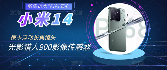 Xiaomi 14 可防溅、防水、防尘,在受控实验室条件下经测试,其效果在IEC60529 标准下达到IP68级别(在最深1.5米的水下停留时间最长可达30分钟)。
