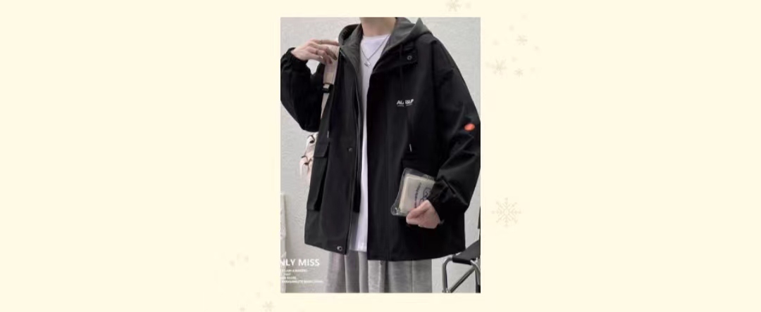 外套男秋冬新款美式连帽宽松廓形机能工装冲锋衣情侣潮牌加厚棉服 黑色 S
