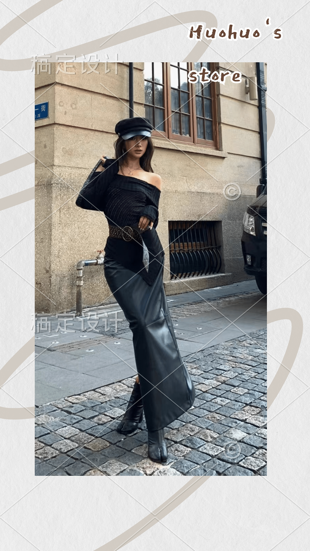 KKSHOP时髦百搭PU皮直筒裙女2023年秋冬新款后开叉百搭包臀半身裙