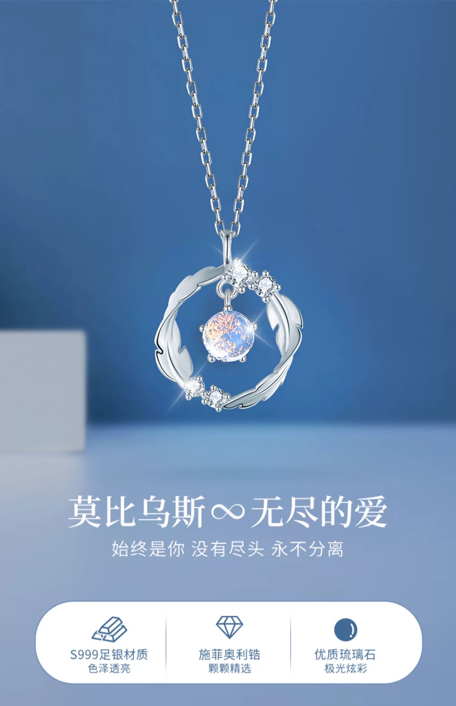 佩戴难易 易! 外观设计 莫比乌斯环的设计灵感,外加琉璃石的悬空,整体精美,链子与吊坠的配合极佳 做工材质 做工精细,无瑕疵,刻字也很好的!!!很喜欢刻的字 佩戴效果 如图吧,链子的长短适合产品质量 纯银,链子也是纯银的哈哈哈哈
