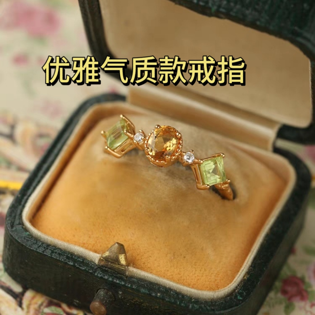 戒指银镀金简约复古橄榄石开口指环