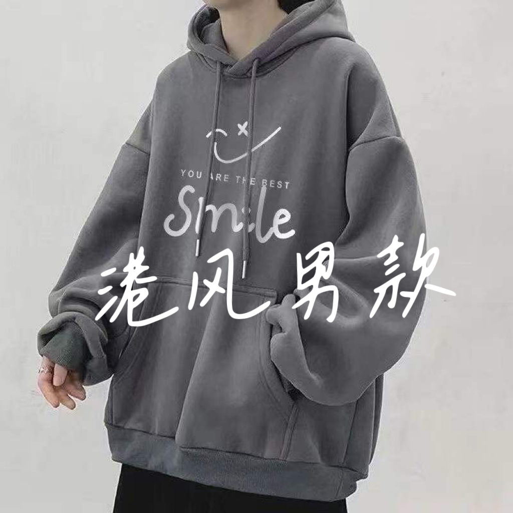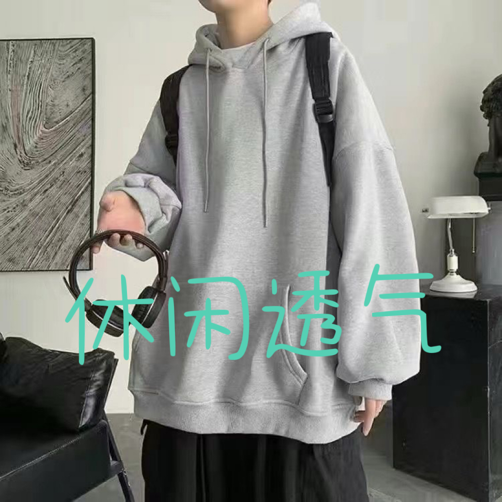 男装薄款连帽灰色卫衣男秋冬季ins潮牌简约宽松加绒加厚