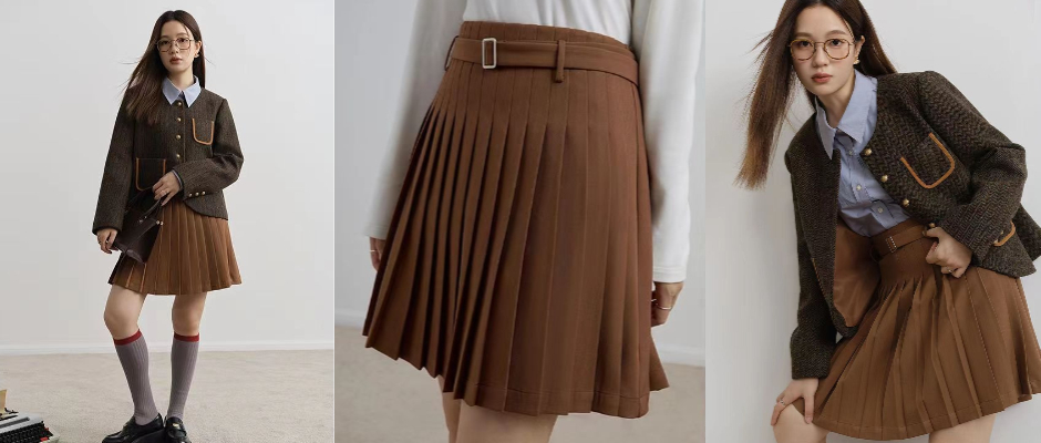 独束大码女装可拆卸腰带高腰百褶半身裙冬装新款减龄A字短款裙子 百褶裙 卡其色 s