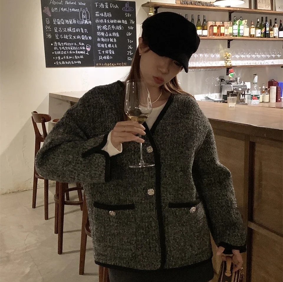 夏诗文 羊毛混纺气质V领廓形双面呢外套女秋冬季正反两穿毛呢大衣