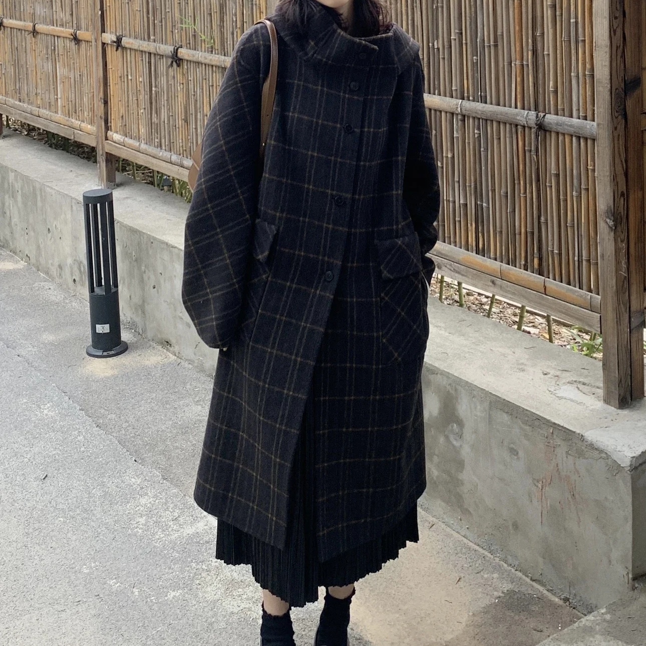 格纹连帽韩系毛呢外套女中长款今年流行时尚气质高级赫本风呢大衣