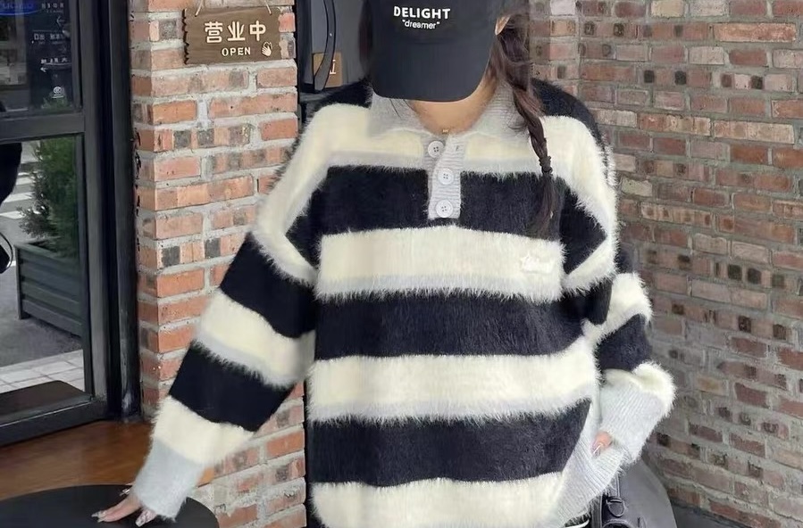日系复古条纹撞色海马毛POLO领毛衣女秋季学院风宽松慵懒风针织衫