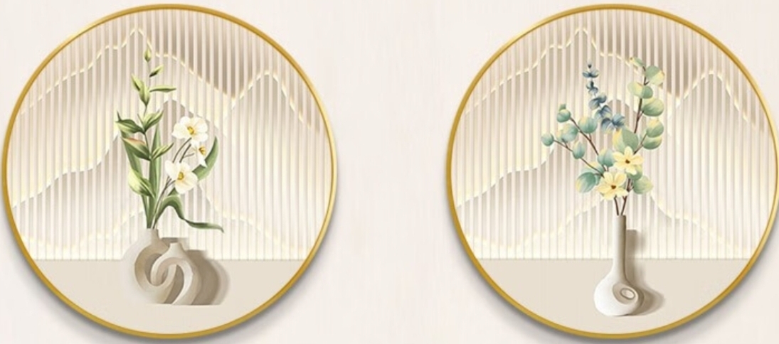 福宁公馆奶油风玄关发光圆形装饰画绿植花卉走廊过道餐厅led灯光画壁挂画