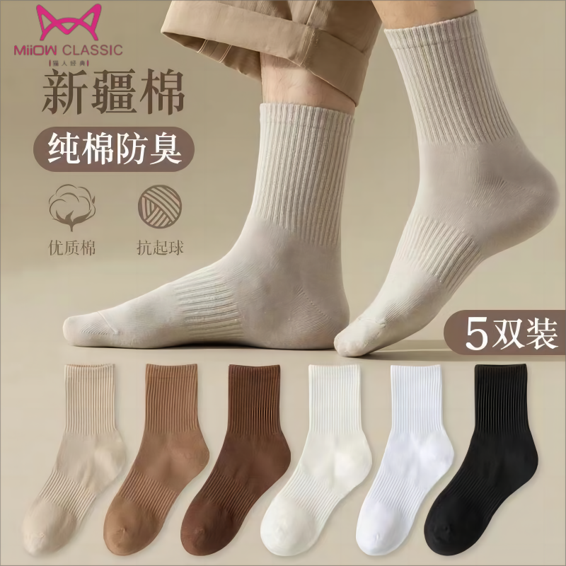 猫人袜子男士中筒袜秋冬季纯色日系运动防臭长袜潮流黑白休闲长袜