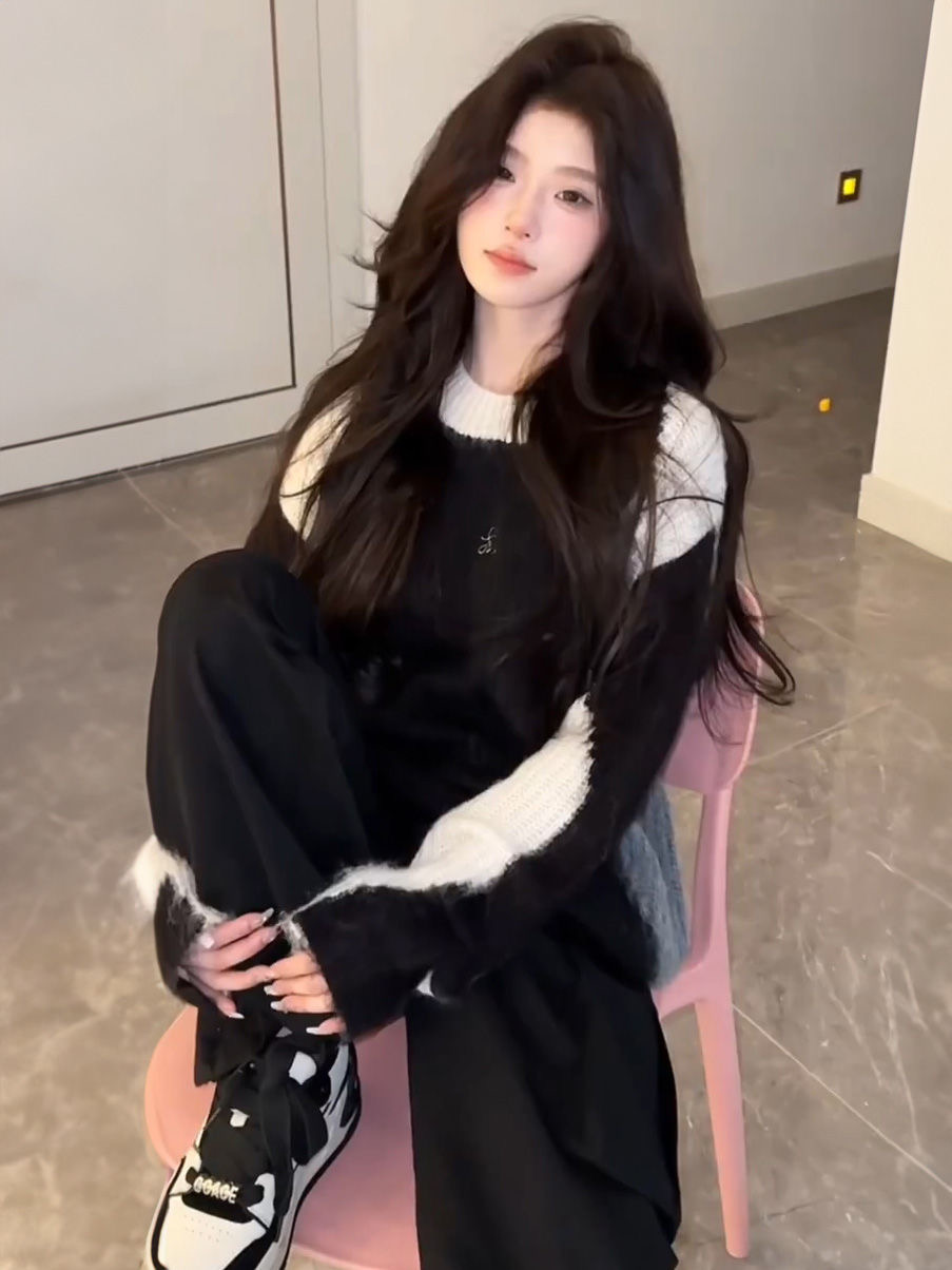 美式复古潮牌慵懒风拼色毛衣女学生秋冬款加厚撞色圆领针织衫上衣