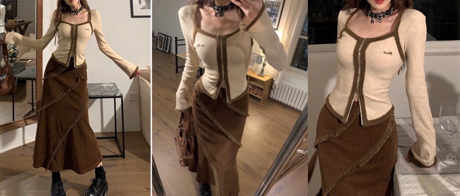 甜辣风毛绒拼接针织衫套装女冬高腰灯芯绒半身裙辣妹修身长袖上衣