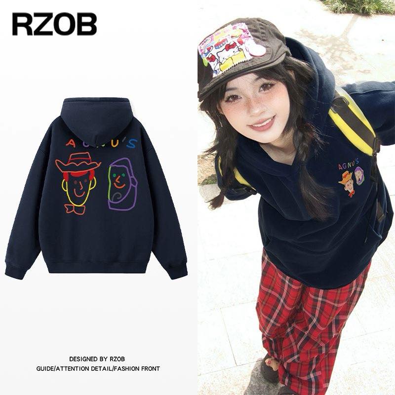 潮流涂鸦人物连帽卫衣女秋冬美潮甜酷宽松加绒加厚减龄校园风上衣
