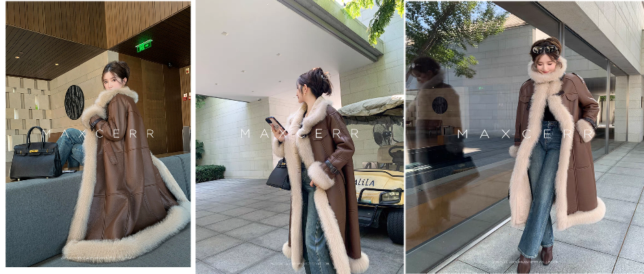 冬季新款美利奴羊羔毛真皮皮毛一体外 套女长款狐狸毛皮单犬衣