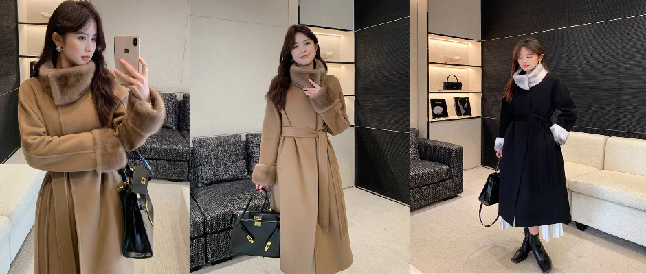 冬季新款高级感毛呢外套水貂毛领双面羊绒大衣女中长款真丝内胆