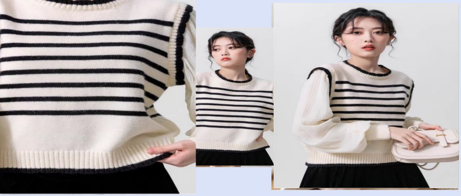 丝柏舍 【拼接条纹针织衫】2023秋装新款女士甜美假两件短款显瘦上衣