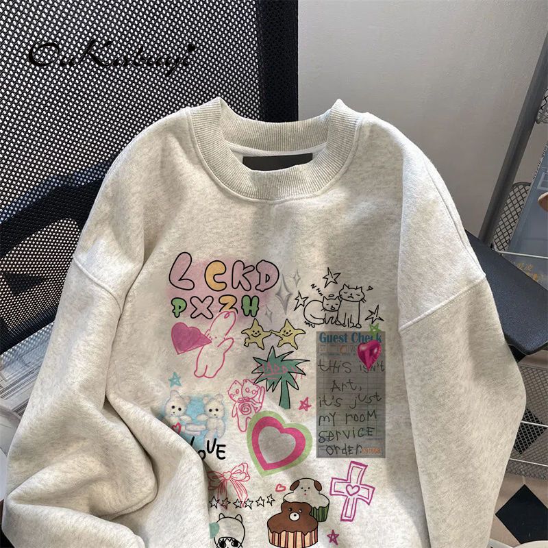 OUKABUYI100%纯棉学院风vintage圆领卫衣女ins潮牌设计感甜美上衣