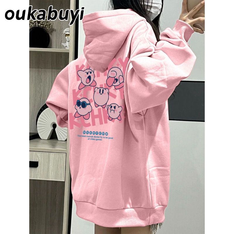 oukabuyi100%纯棉冬季款甜妹风星之卡比印花连帽卫衣女粉色外套