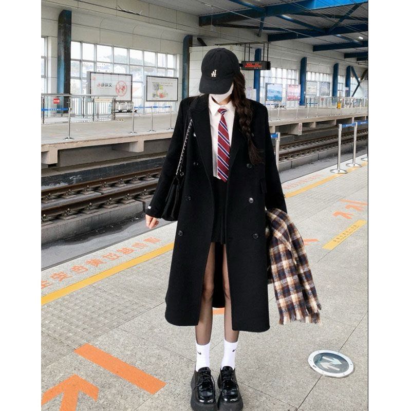 2023秋冬加绒加厚毛呢外套女长款过膝学院赫本高个子西装呢子大衣