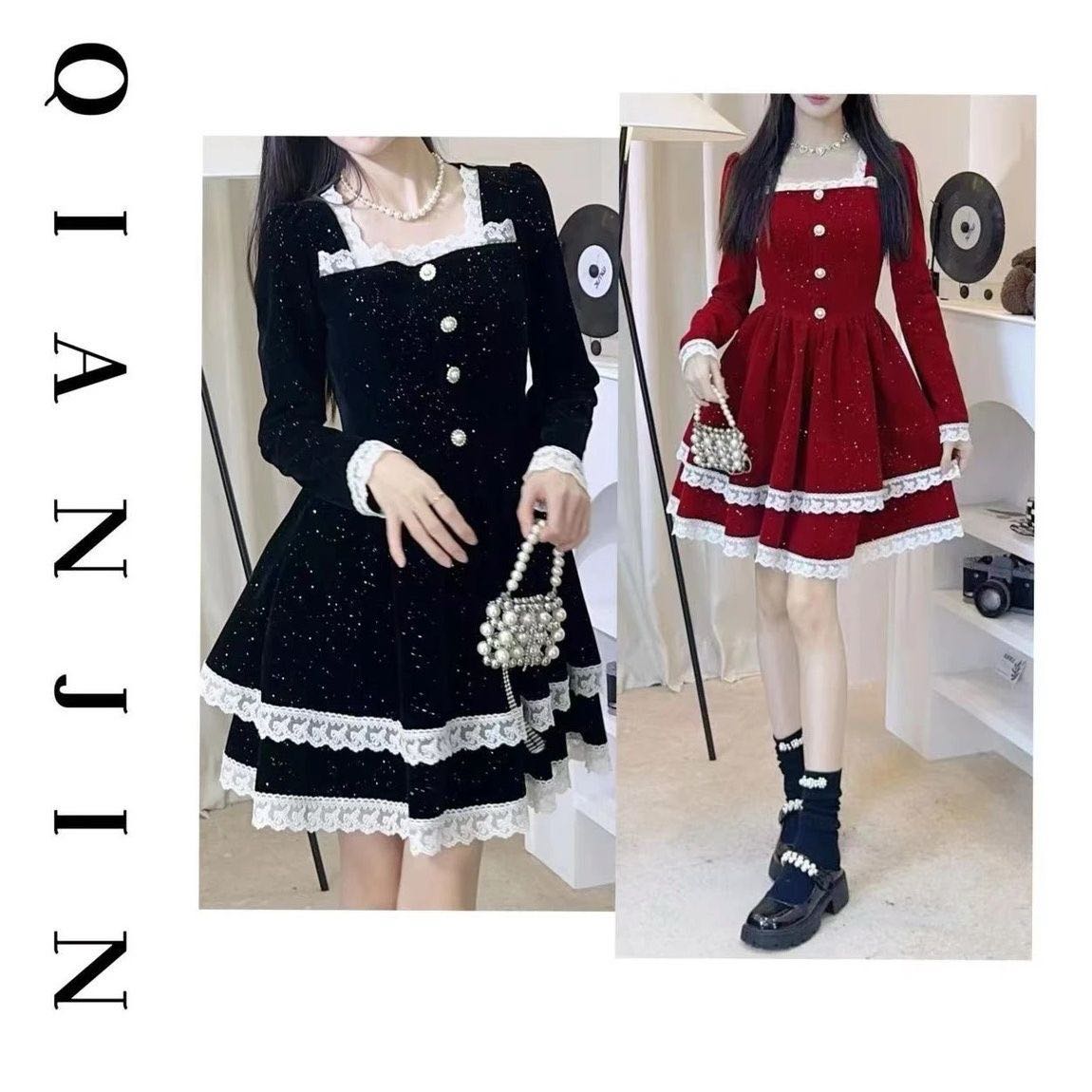 bulingbuling圣诞红收腰裙子复古气质方领修身显瘦连衣裙女士