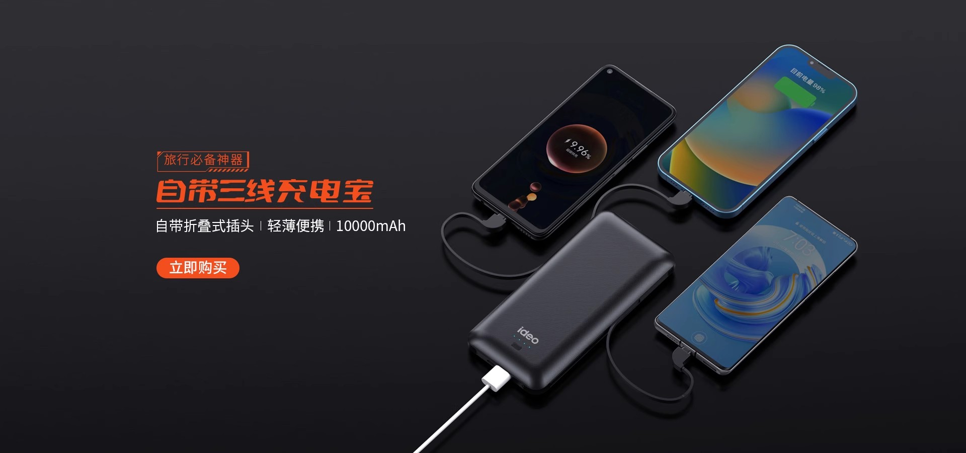 ideo充电宝自带线三合一带插头便携10000毫安大容量自带数据线移动电源快充适用苹果华为typec