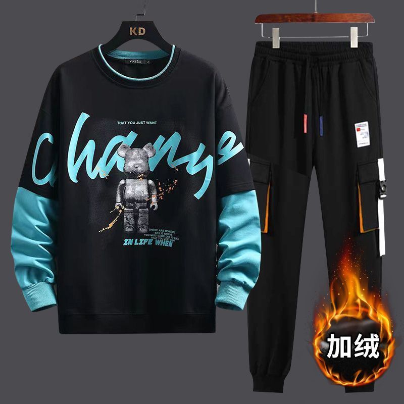 加绒加厚卫衣男套装潮牌秋冬季初高中学生青少年运动连帽帅气外套