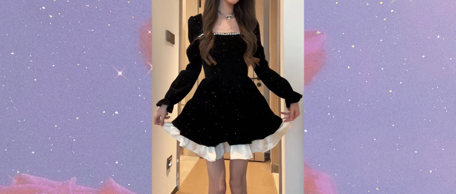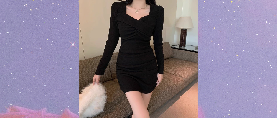 长袖连衣裙女秋冬女装新款高级轻熟褶皱气质紧身修身显瘦黑色裙子
