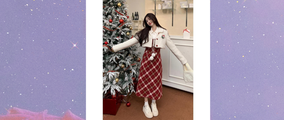 圣诞公主风时尚套装女秋冬2023新款短款羊羔毛外套格子毛呢连衣裙