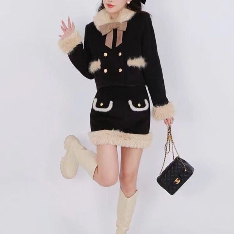 大码小香风外套女2023秋冬新款黑色毛呢拼接毛领加厚小个子上衣