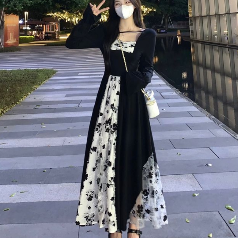 哺乳装外出拼接假两件不规则法式复古蕾丝显瘦长袖哺乳连衣裙秋季